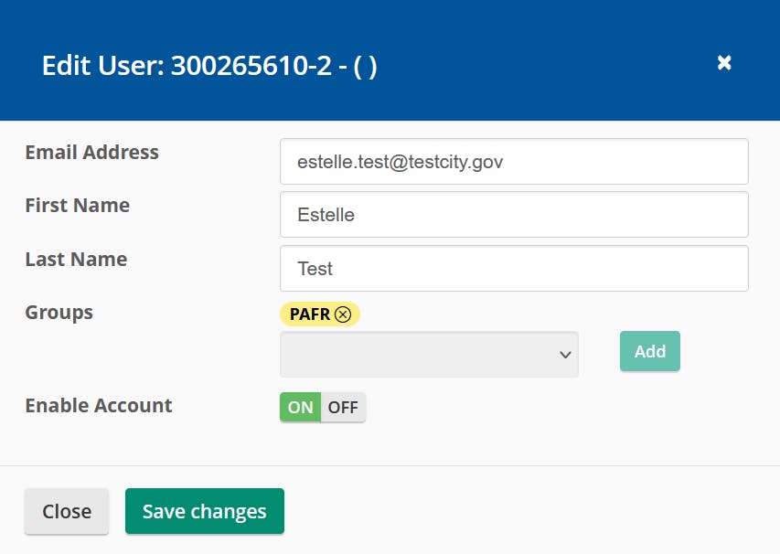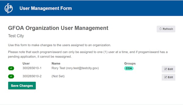 An active user will be assigned one or two groups: either COA or PAFR, or both. When a person is assigned to a group, that person becomes GFOA’s primary contact for the awards program that group represents. The primary contact is the person who can login to the AMS, request extensions and submit applications, and who will receive emails relevant to any applications that have been submitted (such as an email indicating a review has been completed that provides a link for retrieving the result documents).