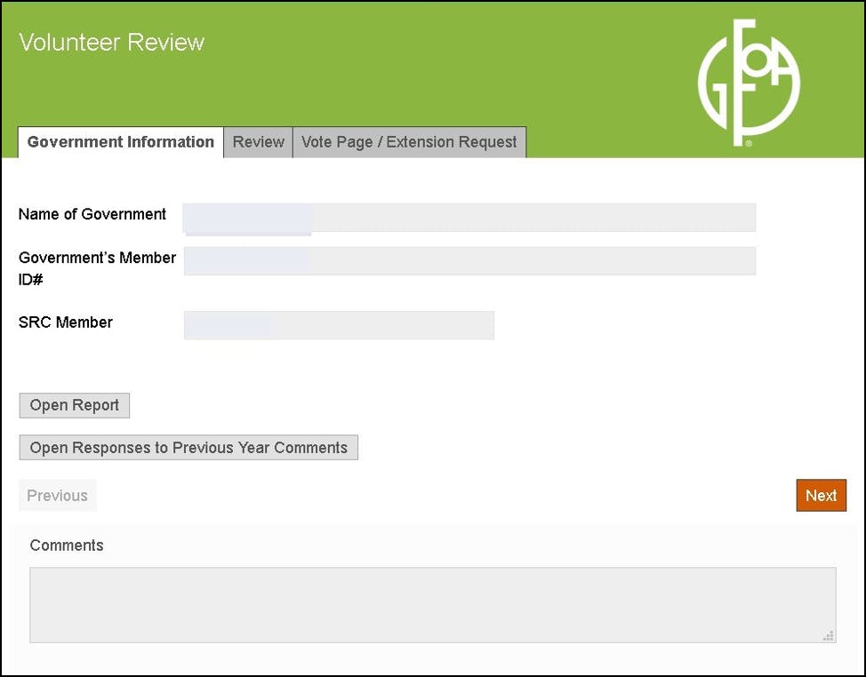 The Government Information tab will have details about the government and links to the Annual Comprehensive Financial Report and their responses to the prior year comments. The second tab has space for you to make comments about each section and apply a grade for each section. Section grading defaults to “proficient.” The final tab allows you to record your recommended final grade.